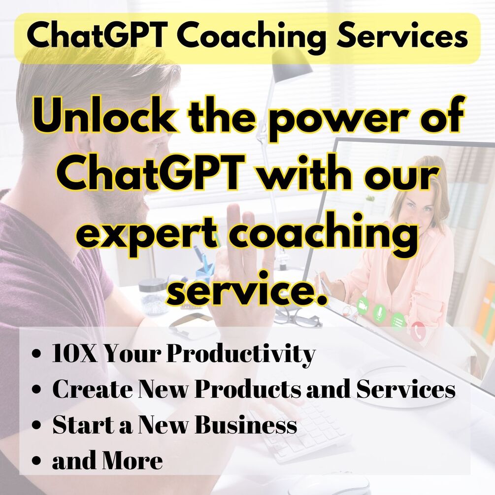 Unlock the power of ChatGPT and take your productivity to the next level! Our coaching service is designed to help you become an expert at using ChatGPT, enabling you to create new products and services, start a new business, or simply become more productive in your day-to-day work.